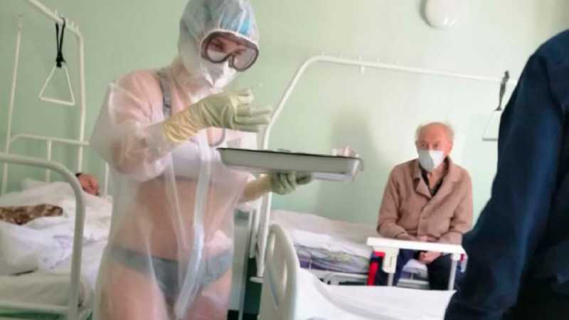 Hot Russian Nurse suspended for wearing a transparent PPE gown showing her bra and panties Hot Russian Nurse suspended for wearing a transparent PPE gown: A...